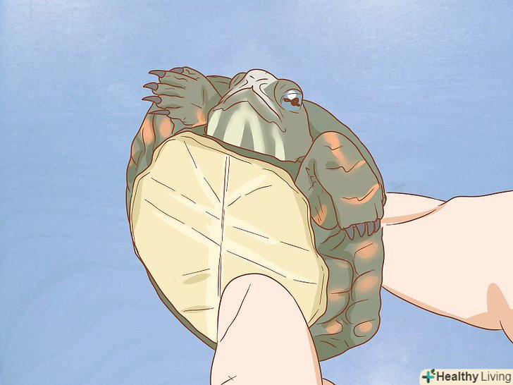 Регулярно оглядайте черепаху на наявністьОзнак хвороби . оглядайте черепаху кожен день або через день (наприклад, під час годувань). Шкіра і панцир повинні бути гладкими. На них не повинно бути плям, мозолів та інших дефектів. Огляньте очі, ніс і дзьоб — там не повинно бути виділень і знебарвлення. Звертайте увагу на незвичайні зміни в поведінці. [17]- У черепах, як правило, міцне здоров'я, але вони можуть підхоплювати інфекції, страждати від поганого харчування і проблем з очима. Якщо помітите тривожні ознаки (розм'якшення панцира, помутніння очей, пухирі на шкірі), як можна швидше віднесіть черепаху до герпетолога.