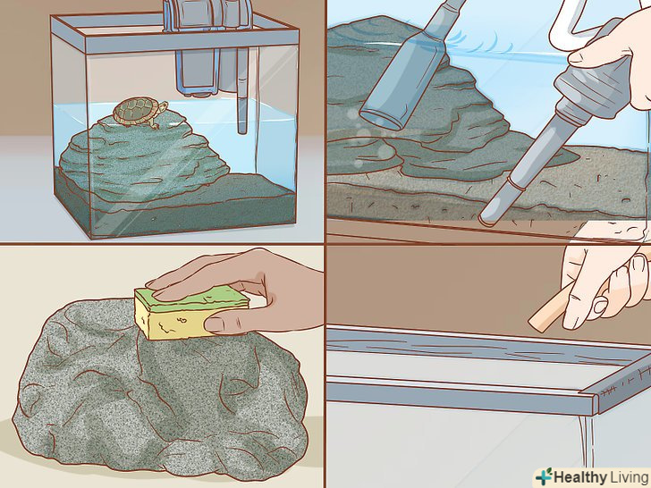 Очищайте Акваріум кожні 3 тижні. на час збирання пересаджуйте черепаху в запасний Акваріум. Залиште чверть або половину води і вилийте решту води. Викиньте Старий мох або землю. Потріть камені, укриття черепахи і внутрішню поверхню акваріума губкою, змоченою в розчині відбілювача (1 частина відбілювача на 10 частин теплої води). [21]- Ретельно промийте акваріум і аксесуари, щоб позбутися від слідів миючого засобу. Потім поставте всі предмети на місця і налийте чисту воду.