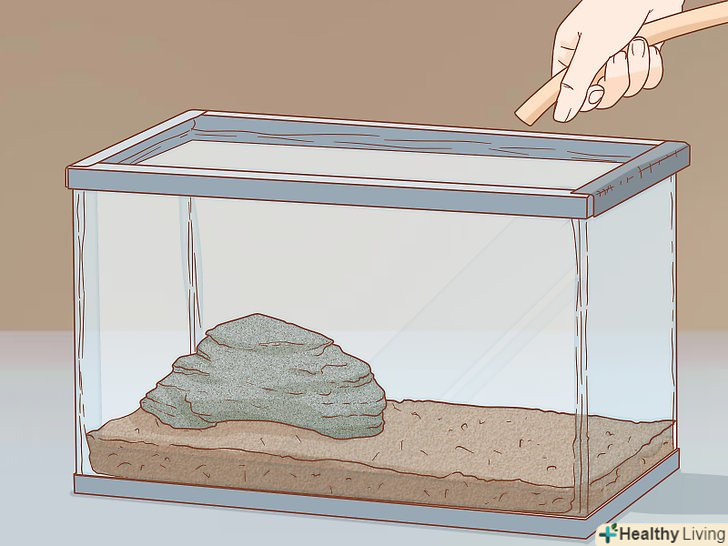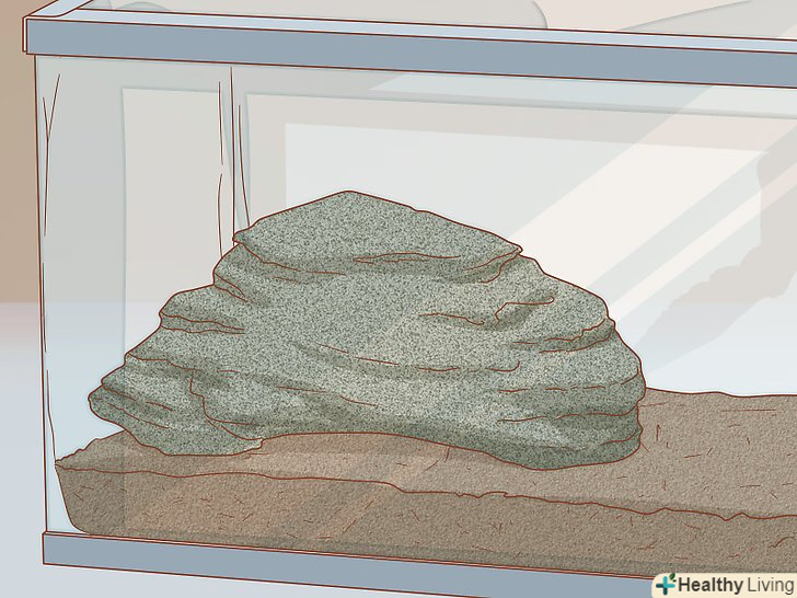 Влаштуйте місце, де черепаха могла б грітися. засипте суміш з піску і землі або моху і стружки на 1 сантиметр більше з одного боку акваріума. Втисніть в поверхню гладкі і широкі річкові камені або шматки дерева в цій частині акваріума. Ця частина завжди повинна залишатися сухою і підніматися над водою. [3]- Зробіть перехід до каменів плавним, щоб черепасі не було складно підійматися туди.