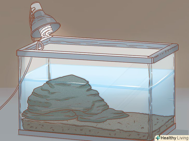 Встановіть лампу для рептилій. важливо передбачити в акваріумі як більш тепле, так і більш холодне місце. Купуйте лампу для рептилій з відбивачем в зоомагазині. Переконайтеся, що це спеціальна лампа для рептилій. Встановіть в акваріумі термометр і стежте за тим, щоб температура в зоні, де черепаха буде грітися, залишалася в рамках 29-32 °C. [6]- Якщо у вашій лампі встановлена лампочка розжарювання, вам також буде потрібно флуоресцентна лампа з ультрафіолетовим світлом спектра а і B. ультрафіолет забезпечить черепаху вітаміном D, який потрібен для правильного засвоєння кальцію.
