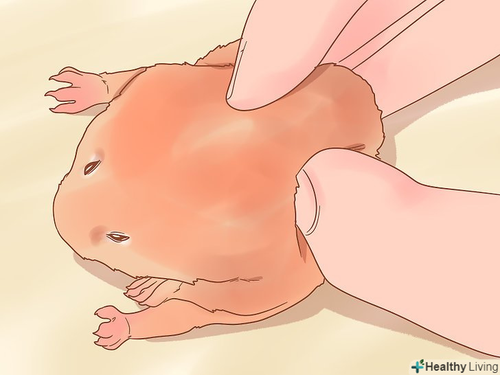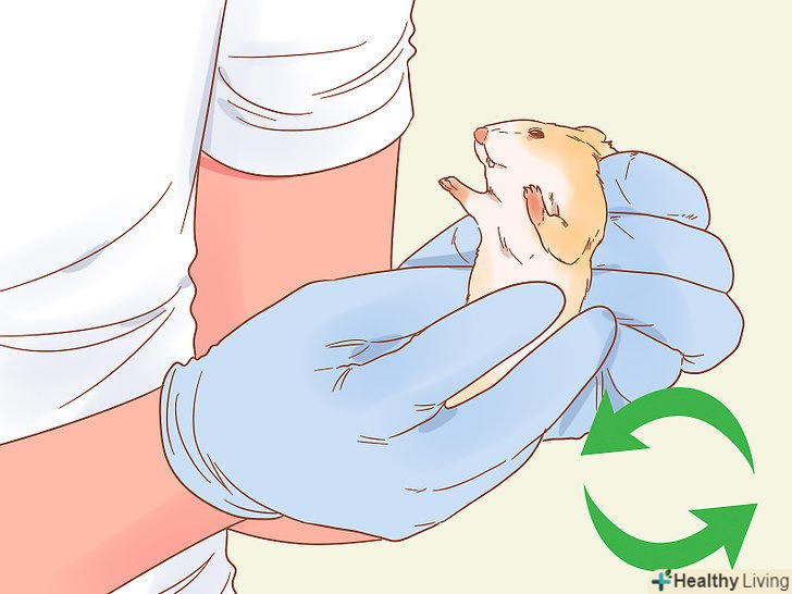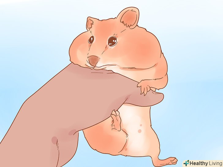 Візьміть хом'ячка на руки. спокійно підійдіть, не злякайте його. Помістіть долоню так, щоб великий і вказівний палець були прямо над лопатками. Акуратно візьміться за складочку шкіри трохи вище плечей хом'ячка (між великим і вказівним пальцями), щоб притримувати голову хом'яка і уникнути укусів. [2]- Ні в якому разі не тягніть за складочку шкіри і не намагайтеся підняти хом'ячка! [3]