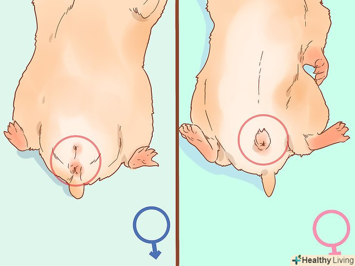 Оцініть відстань між анусом і сечостатевим отвором. статеві відмінності важче виявити, якщо у хом'ячка ще не настало статеве дозрівання. Але спробуйте придивитися до відстані між анусом і сечостатевим отвором. У самок це відстань менше, ніж у самців. Насправді, знайти ці отвори не так легко, як здається. Якщо у вас самка, до того ж ще зовсім маленька, ці два отвори можуть здатися вам одним і тим же. Але у самців ці отвори знаходяться далі один від одного, тому між ними можна помітити чітке розходження. [8]- У самців можна помітити невеликі набряки в області паху — це розвиваються яєчка.