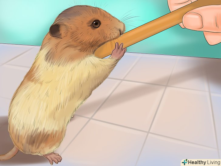 Надайте хом'ячку паличку для сточування зубів. вони випускаються в різних розмірах, кольорах і смаках. Так як зуби вашого хом'ячка ростуть постійно, він потребує їх сточуванні. Для цієї мети підійдуть ці палички. Постарайтеся запропонувати хом'ячку різні види паличок, щоб зрозуміти, які саме подобаються йому найбільше. Деякі хом'ячки зовсім відмовляються від цих паличок. Якщо таке сталося у вашому випадку, будьте готові до того, що хом'ячок буде гризти інші об'єкти в клітці, наприклад, її прути. [18]