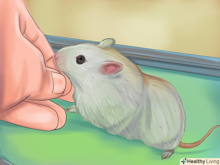 Почніть приручати хом'ячка. починаючи з другого тижня перебування хом'ячка у вас вдома ви можете почати проводити з ним короткі уроки по прирученню. Здебільшого хом'ячки активні з раннього до пізнього вечора і вночі. Постарайтеся вивчити індивідуальні особливості Вашого хом'ячка і проводити уроки по приручення тоді, коли він найбільш активний. [21]- Для приручення хом'ячка опустіть свою руку до нього в клітку. Дозвольте хом'ячку обнюхати її і вивчити. Якщо хом'ячок м'яко кусне вас, але не буде проявляти агресії, обережно відведіть руку назад, але негайно дозвольте хом'ячку досліджувати її заново. Це допоможе йому зрозуміти, що руку не можна їсти, а також не слід її боятися. Потім помістіть в руку частування, для цього непогано використовувати зернову суміш; через те, що вона використовується лише у вигляді додаткового корму до основної гранульованої дієті, хом'ячкам вона дуже подобається. Ваш хом'ячок повинен звикнути залазити до вас на руку, зрозумівши, що на неї можна підійматися. У міру того, як хом'ячок буде краще звикати до руки і спокійніше ставитися до того, щоб видертися на неї, почніть поступово класти частування все далі і далі в руці.