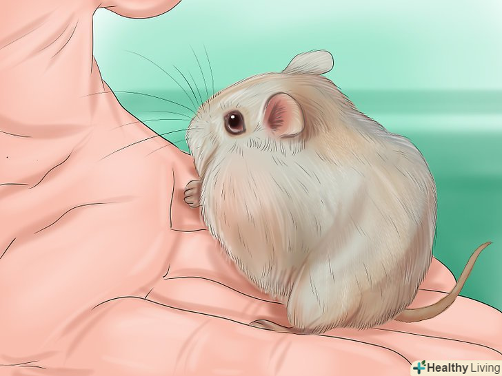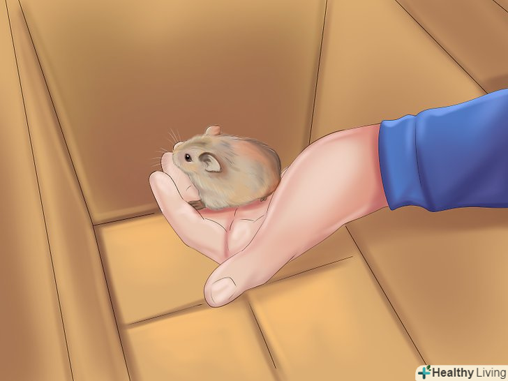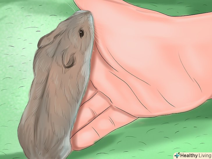 - Якщо ваш хом'ячок робить хороший прогрес в прирученні, спробуйте запропонувати йому руку без частування і пригостити його тільки після того, як він видереться на неї. Ваш хом'ячок зрозуміє, що в руці немає нічого поганого. Потім запропонуйте хом'ячку видертися на руку і повільно підніміть її з дна клітини. Спочатку хом'ячок може налякатися, продовжите з ним ласкаво розмовляти і запропонуйте частування, щоб йому стало комфортніше. Під час виконання даного кроку сядьте на підлогу, так як хом'ячок може спробувати вислизнути з ваших рук і постраждати від падіння з висоти вище 15-20 сантиметрів. [22]