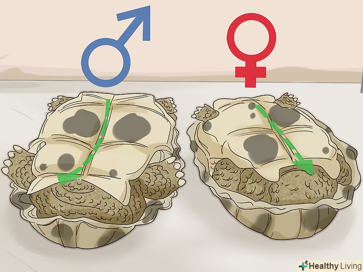 Подивіться на панцир черепахи. Черепашки черепах, або панцирі, трохи відрізняються залежно від статі. Панцир у дорослого самця має більш подовжену форму в порівнянні з панциром дорослої самки. [1]- При визначенні статі черепахи цей метод може бути дуже обмежений, тому що ви повинні переконатися, що черепаха досягла статевої зрілості. Можливо, ви вирішите, що це самець, але насправді виявиться так, що черепаха ще не досягла своєї статевої зрілості.