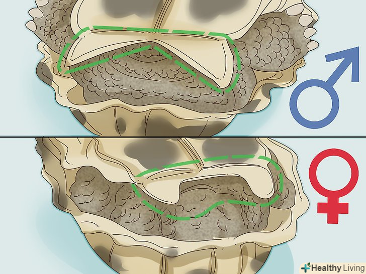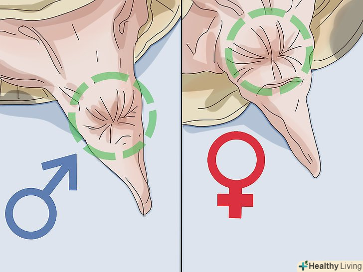 Вивчіть пластрон черепахи. Пластрон-це Нижня (черевна) частина панцира. Щоб вивчити пластрон, обережно переверніть черепаху пластроном вгору. Вони не люблять бути перевернутими і можуть спробувати вкусити, тому тримати черепаху слід за краю панцира у хвоста, щоб вона не дістала до вас. Обережно переверніть черепаху і подивіться на пластрон. Пластрон у самця злегка увігнутий (згинається всередину), а у самки він плоский. [2]- Увігнутий пластрон самця черепахи дозволяє тварині утримуватися на самці під час спарювання.