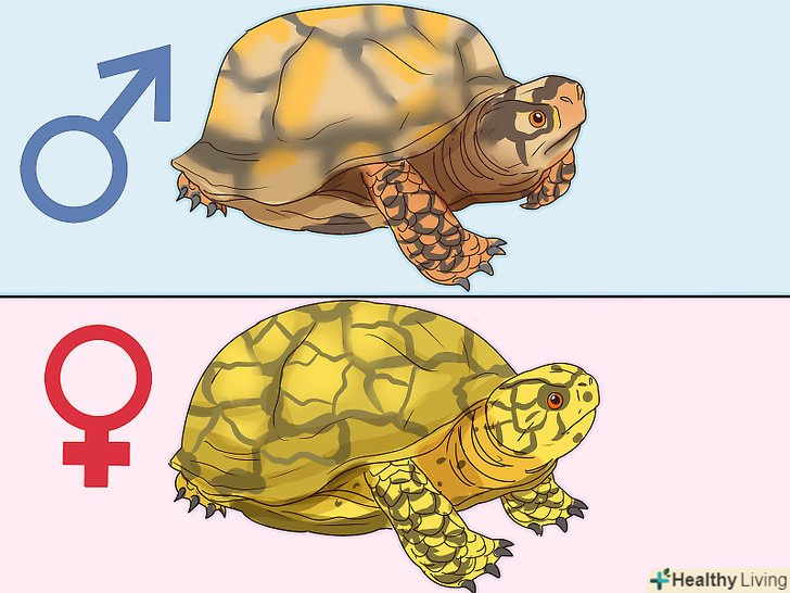 Подивіться на видові особливості. деякі види черепах мають характерні статеві відмінності в забарвленні:- Американська коробчатая черепаха: у 90% випадків райдужні оболонки очей у самців червоні або помаранчеві, а у самок — коричневі або жовті. Крім того, самки мають більш високий куполоподібний панцир, округленої форми, в той час як самець має більш сплющений овальний або довгастий за формою панцир.