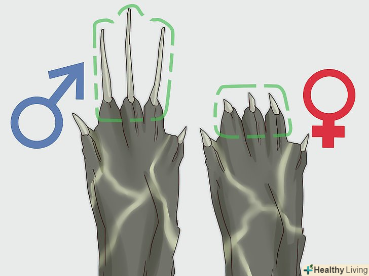Огляньте кігті черепахи. самці черепах використовують свої кігті під час спарювання з самками. Вони також використовують свої кігті, щоб боротися і захищати свою територію. Таким чином, кігті на передніх лапах у самців, як правило, довше, ніж у самок. Знову ж таки, це більш очевидно, коли для порівняння один з одним у вас є Дві черепахи різної статі. [4]- У Червоної болотної водної черепахи є яскраво виражена різниця між кігтями самця і самки.
