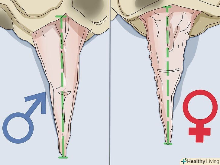 Оцініть довжину хвоста черепахи. геніталії самця розташовані в хвості, і, щоб вмістити їх, хвіст у самців зазвичай довше і товщі, ніж у самок. Хвіст у самок коротше і тонше. [6]- Щоб визначити стать черепахи за цим методом, ви повинні знати розмір хвоста у самця або у самки. В іншому випадку цей спосіб може бути ненадійним.