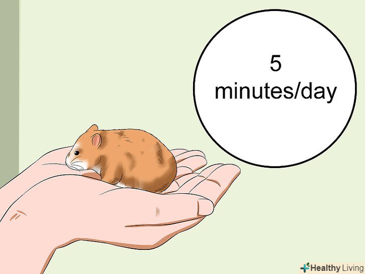 Тримайте хом'ячка в руках нетривалий час. перебування в руках може надавати на хом'ячка стрес. Постарайтеся в перший час брати його на руки всього на 1-2 хвилини, а потім з кожним черговим разом почніть поступово збільшувати тривалість спілкування. Націльтеся на те, щоб спілкуватися з хом'ячком на руках приблизно по п'ять хвилин в день.