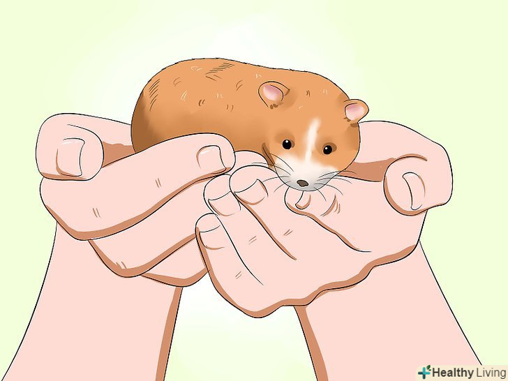 Візьміть хом'ячка в руки. коли хом'ячок вже звикне до рук, повільно опустіть в клітку відразу обидві руки. Тримайте долоні чашкою і чекайте, коли хом'ячок сам забереться в них. Підтримуйте його обома руками, поки повільно виймаєте з клітки. [27] простежте за тим, щоб в цей момент хом'ячок був звернув мордочкою до вас, так він буде краще розуміти, що відбувається, і з меншою ймовірністю захоче зістрибнути вниз. [28]- Якщо хом'ячок злякається і вирішить зістрибнути, поки ваші руки все ще знаходяться в клітці, дозвольте йому це зробити. [29]