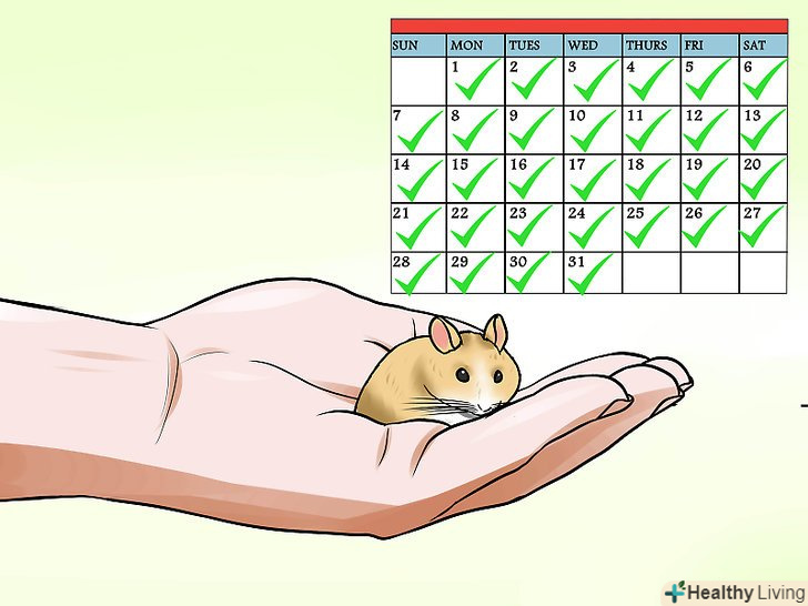 Беріть хом'яка на руки щодня. щоб приручити хом'яка, необхідно проводити з ним час кожен день. Намагайтеся брати вихованця на руки кілька разів на день і тримайте кожен раз близько п'яти хвилин. [17] якщо ви проявите наполегливість і будете займатися з вихованцем щодня, ваш хом'ячок досить скоро стане ручним і буде сам забиратися у ваші долоні.- Постарайтеся виділити певний час для спілкування з вихованцем і присвячувати цей час приручення тварини кожен день. В цьому випадку хом'як буде знати, коли саме ви прийдете.