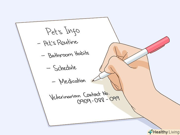 Напишіть докладні інструкції. якщо ви залишаєте тварину під чиюсь опіку, дуже важливо надати цій людині достатньо інформації по догляду. Залиште свої контакти, а також номер ветеринара на екстрений випадок. Якщо у вихованця є спеціальна дієта або він любить певний догляд або іграшки, запишіть все це. Включіть інформацію про його розпорядок, куди він ходить в туалет, чим займається і чи є у нього які-небудь медичні приписи. [4] якщо у тварини є особливості в характері, про які варто знати, включіть їх в список. Вихованець збуджується, коли хтось біля дверей? Чи є у нього улюблене місце для хованок?- Включайте якомога більше деталей в інструкцію. Краще дати більше інформації, ніж менше.