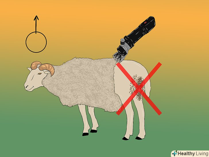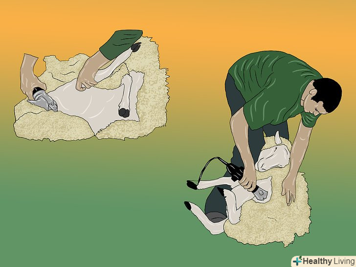 Почніть стригти живіт. зазвичай шерсть на животі вівці найбрудніша і не представляє цінності для продажу. Саме тому стрижку починають з цього місця.- Довгими впевненими махами зістрижіть шерсть від грудей вниз по відкритому боці.