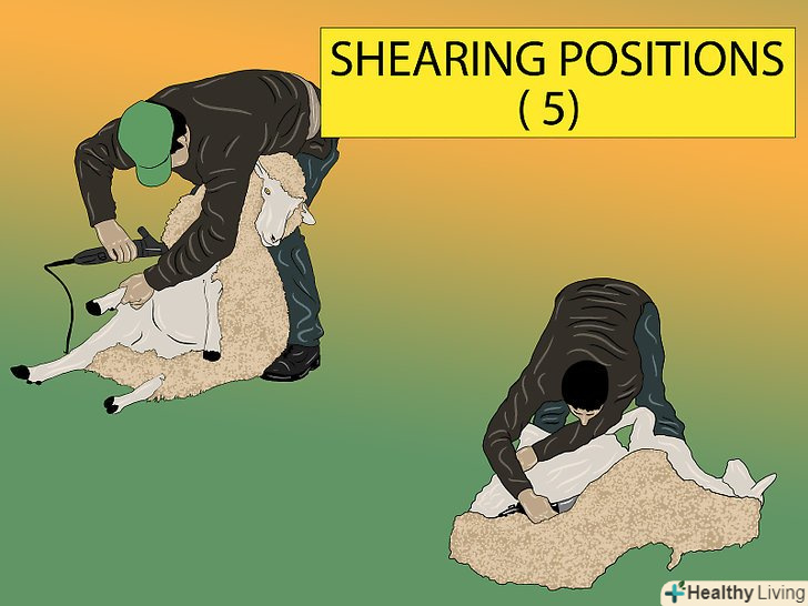 Правильно розташуйте вівцю. першим кроком стрижки вівці є правильне її розташування. Є п'ять основних позицій, які потрібно використовувати під час стрижки.- У першій позиції необхідно акуратно перевернути вівцю на спину і зафіксувати її плечовий пояс у себе між колін. Повинен відкрити живіт вівці, а її ноги повинні стирчати вгору.