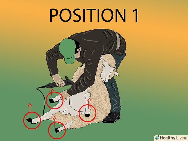 - У першій позиції необхідно акуратно перевернути вівцю на спину і зафіксувати її плечовий пояс у себе між колін. Повинен відкрити живіт вівці, а її ноги повинні стирчати вгору.