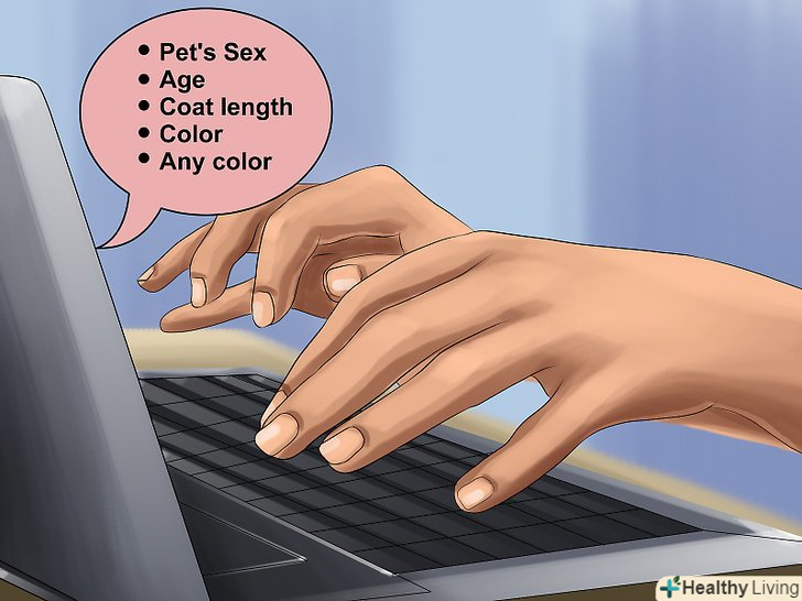 Включіть в оголошення важливу інформацію про свого вихованця. відразу переходите до деталей. Люди зазвичай не люблять читати довгі абзаци тексту, тому ефективно представити інформацію вам допоможе маркований список. Вкажіть стать, вік, тип шерсті тварини, інформацію про наявність нашийника та інформаційних бирок.- Якщо тварина чіпована, також повідомте про це, але не вказуйте номер мікрочіпа.