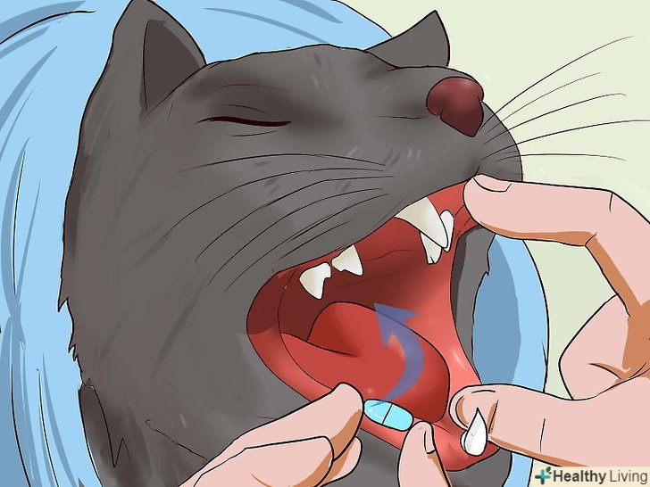 Киньте таблетку в рот. намагайтеся потрапити до задньої частини мови. Якщо таблетка виявиться далеко в горлі, кішка не зможе її виплюнути — м'язи язика лише проштовхнуть її глибше. [7]- Якщо таблетка впаде на кінчик язика, продовжуйте утримувати пащу відкритою, а середнім пальцем проштовхніть її далі.