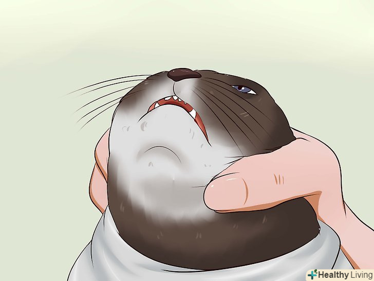 Покладіть кінчики вказівного і великого пальців на верхню частину пащі кішки. розмістіть пальці так, щоб великий палець виявився з одного боку морди, а великий — з іншого. [4]- Підніміть голову до стелі, і паща відкриється.