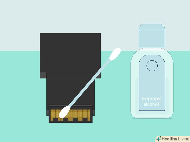Почистіть металеві коннектори Action Replay.не користуйтеся побутовими миючими засобами, тому що вони можуть пошкодити коннектори пристрою. Візьміть ватяну паличку, нанесіть на неї трохи ізопропілового спирту (концентрація 70-90%) і протріть металеві коннектори Action Replay.[4]- Металеві конектори розташовані знизу на задній поверхні Action Replay. Вони мають вигляд металевих плоских зубців, схожих на зуби гребінця.