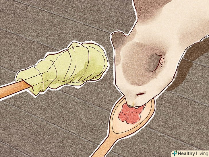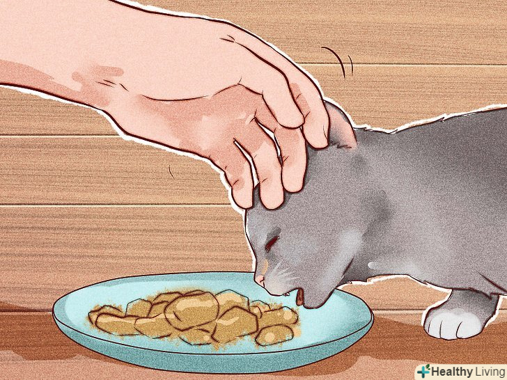 Дозвольте кошеня облизати пальці. коли кошеня звикне до вашої присутності під час його годування, запропонуйте йому поїсти у вас з рук. Ви можете запропонувати йому або консервований котячий корм, або дитячі м'ясні консерви (яловичину або курку).- Кошеня може спробувати заковтнути пропоновану йому їжу, а не злизати, так як він звик саме до цього. Він навіть може злегка прикусити ваш палець, коли ви будете його годувати.