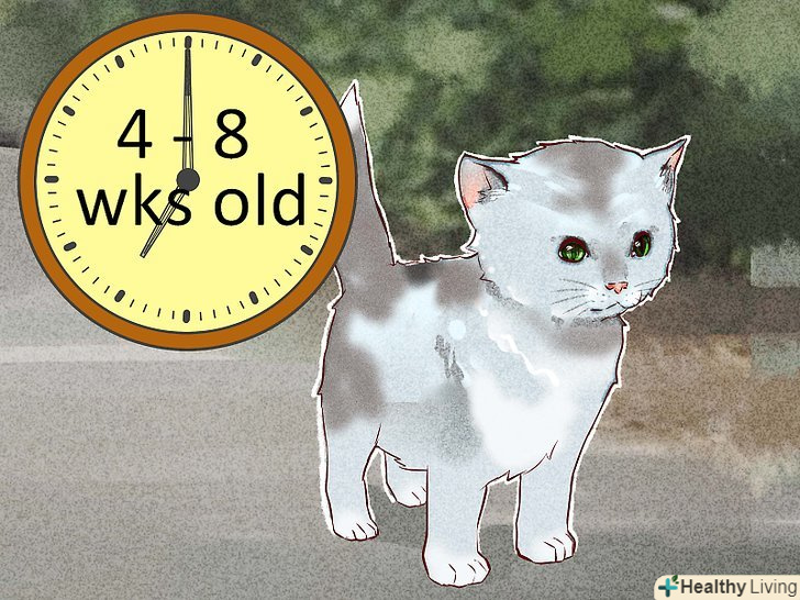 Спробуйте приборкати кошеня у віці від 4 до 8 тижнів. кошеня, який поступово припиняє харчуватися молоком матері, буде краще приручатися. На даному етапі він стає більш незалежним від матері. Як тільки він буде соціалізований, його можна буде забрати до себе. [15]