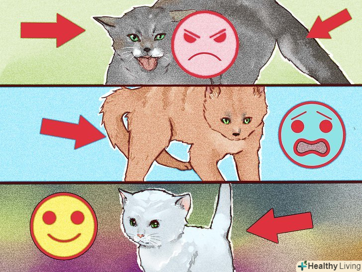 Спостерігайте за мовою тіла кішки, щоб зрозуміти її настрій. кішки прекрасно можуть повідомляти про свій настрій за допомогою мови тіла, який досить зрозумілий. [2] Вам не завадить ознайомитися зі змістом нижчезазначених сигналів мови тіла.- Розсерджена або засмучена кішка буде притискати вуха, розширювати зіниці, розмахувати хвостом, вигинати спину і ставити шерсть дибки. Зазвичай при цьому вона буде ще й гарчати. Це явні вказівки до того, щоб ви залишили її в спокої.