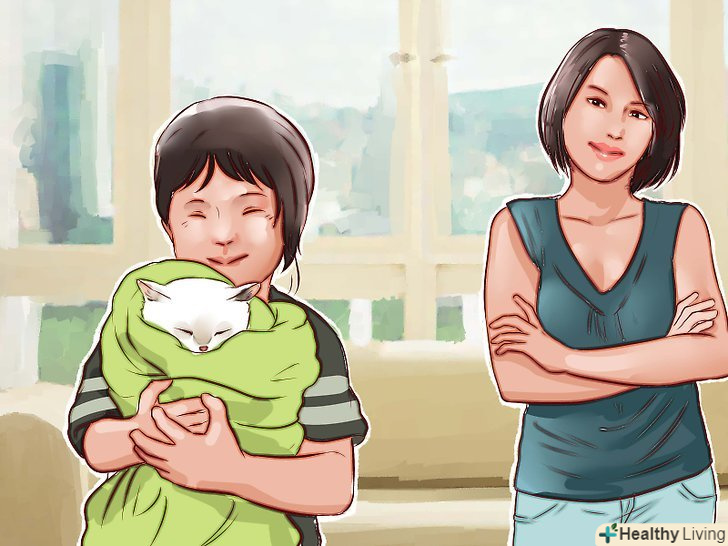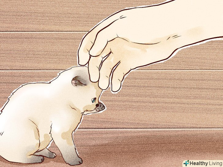 Повільно познайомте кошеня ближче з іншими людьми. якщо ви приручаєте кошеня, щоб забрати його собі, то вам слід подбати про те, щоб він навчився спілкуватися і з іншими людьми, крім вас. [20]- Почніть дозволяти іншим людям по одному спілкуватися з кошеням. Вони повинні пробувати погодувати його спочатку з миски, а потім з рук. Кошеня повинен буде звикнути до їхніх голосів, запахів і поведінки.