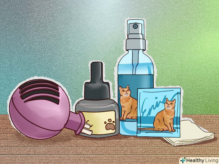 Скористайтеся синтетичними котячими феромонами. Якщо ви хочете допомогти кішці відчути себе більш комфортно, то можна спробувати скористатися феромонами. Синтетичні котячі феромони імітують запахи речовин, вироблених тілом кішки в стані спокою. [9] феромони можна придбати у вигляді спрею і обробити їм територію, на якій мешкає кішка. Однак, кішку може засмутити або налякати звук роботи самого спрею.- Також випускаються просочені котячими феромонами серветки, якими можна протерти певну територію. Якщо ж кішка знаходиться в приміщенні, то ви можете скористатися балончиком з феромонами для фумігатора.