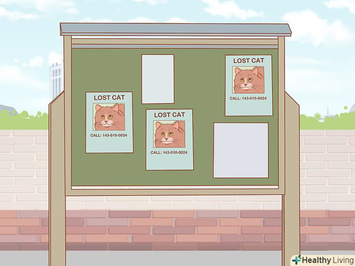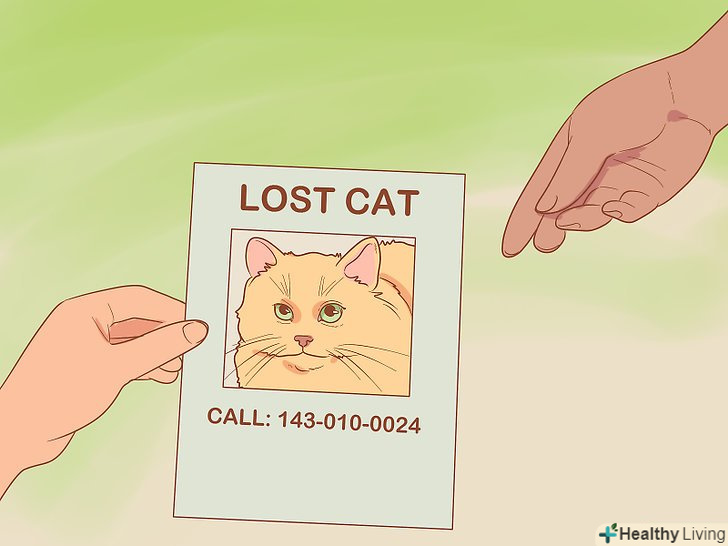 Розвісьте оголошення в правильних місцях. найкраще розвісити оголошення в радіусі півтора кілометрів від будинку. [10] крім того, є кілька стратегій ефективного розташування оголошень, тому для оголошень можуть підійти і більш віддалені місця, до яких вам також не завадить пройтися. [11]- Повісьте оголошення у ветеринарних клініках на той випадок, якщо хтось принесе на лікування вашу травмовану кішку або захоче стати її новим власником.