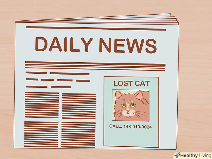 Дайте оголошення в місцевій газеті. Заплатіть місцевій газеті за публікацію оголошення про зникнення кішки з описом зовнішності вихованця і зазначенням вашого телефону. Чим більш обмеженого місцевого значення буде газета, тим краще. Якщо у Вашому регіоні немає місцевих газет, спробуйте домовитися з будь-якими місцевими громадськими центрами, що здійснюють розсилку інформаційних листів серед своїх клієнтів, щоб інформація про зникнення кішки була включена в один з чергових листів.