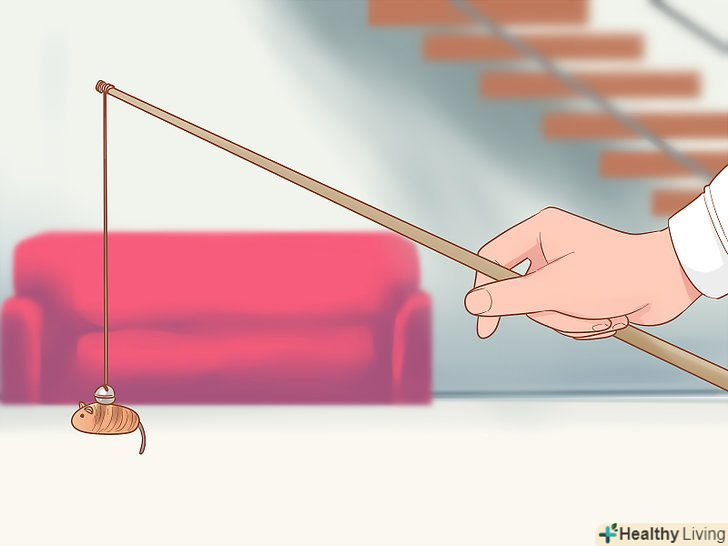 Візьміть з собою улюблену іграшку кішки. якщо у вашої кішки є улюблена іграшка на зразок мишки або пучка пір'я на мотузочці або паличці, прихопіть її з собою на пошуки і тримайте на виду, як якщо б ви хотіли пограти з кішкою. Це може переконати кішку не боятися і вийти з укриття.