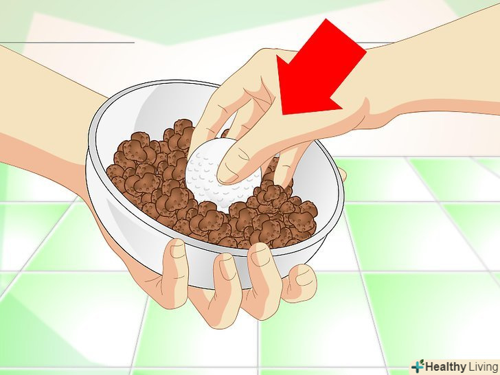 Покладіть м'ячик для гольфу в миску з кормом. М'ячик для тенісу або гольфу (або інша перешкода) змусить вашу кішку їсти повільніше, адже їй доведеться робити паузи для того, щоб пересунути предмет або підійти до миски з іншого боку.- Така перешкода повинна бути досить великою, щоб кішка її не проковтнула (м'яч для гольфу або тенісу підійде).