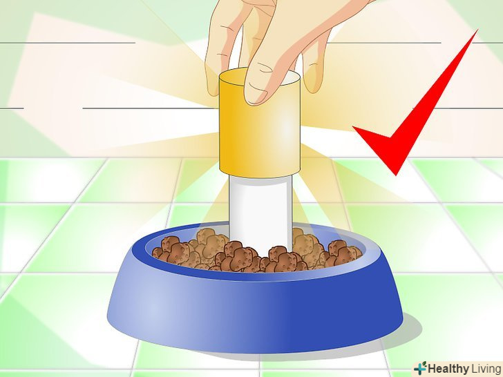 Купіть миску з виступами. у багатьох магазинах товарів для тварин продаються миски для кішок і собак з великим виступом посередині або декількома маленькими виступами. розподіленими по мисці. Завдяки такій мисці ваша кішка навчиться їсти повільніше і брати менше їжі за раз. [4]