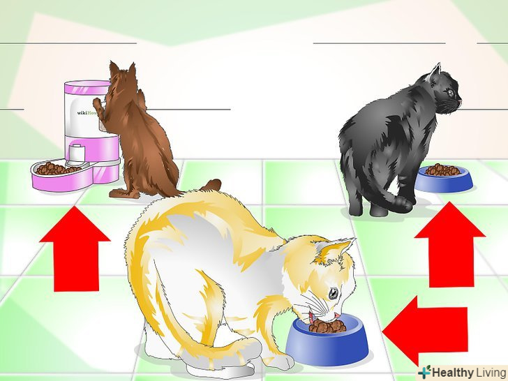Якщо у вас багато котів, вони повинні мати різні місця для годування. коли в будинку більше однієї кішки, то часто виникає наступна проблема — одна кішка залякує іншу і з'їдає її їжу або одна кішка уминает всю їжу, коли приходить час годування. Всього цього можна уникнути, якщо ставити миски для кожної кішки в різні місця, в ідеалі в окремих кімнатах і різних частинах будинку. Так кішки будуть змушені розходитися по своїх місцях на час годування, і у кожної буде достатньо часу і місця, щоб з'їсти свою їжу. [7]- Ви можете допомогти своїм кішкам їсти повільніше, якщо будете годувати їх окремо один від одного, кілька разів на день маленькими порціями.