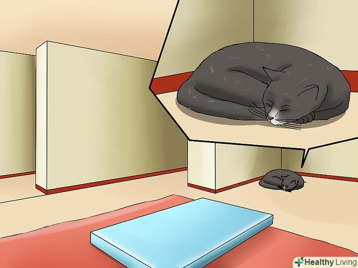 Забезпечте коту безпечні місця укриттів. найчастіше кішкам просто потрібно впоратися з власними боязкими реакціями за допомогою Укриття в безпечному місці. Наприклад, якщо ваш кіт боїться чужих людей, дуже ймовірно, що він буде намагатися сховатися при першому ж дзвінку в двері. Подумайте про те, щоб розмістити котячу клітку в тихій спокійній кімнаті, що буде давати вихованцеві можливість ховатися в ній до того моменту, коли він вирішить знову вийти. [13]- Кішки також відчувають себе в безпеці на високо розташованих місцях. Подумайте про забезпечення кота ігровим комплексом у вигляді вежі, у якого буде матися високо розташоване укриття для тварини; це особливо корисно, якщо джерелом страху кота служить з'явилася в будинку собака.