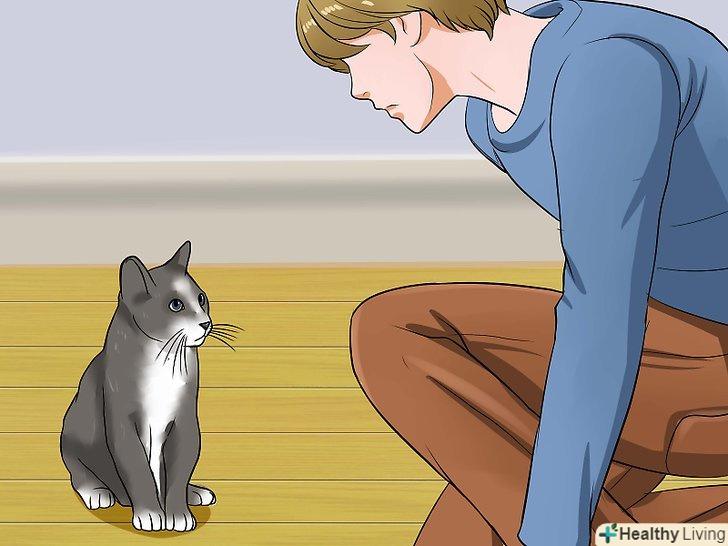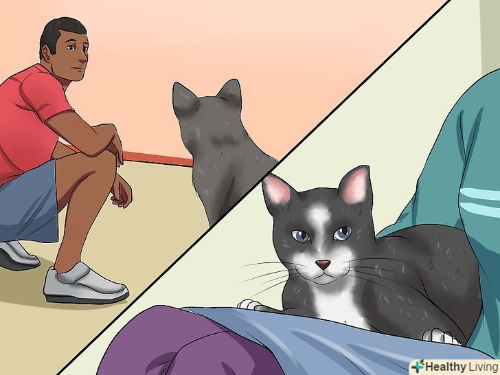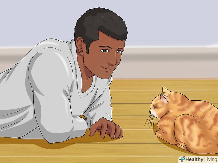 Дозвольте коту підійти до вас. Сядьте або приляжте на підлогу, взявши в руки частування. Дозвольте коту принюхатися і озирнутися. Навіть якщо він дотримується дистанції і просто оглядає вас, в ньому поступово зростає впевненість, що ви не уявляєте загрози.- Якщо ваш кіт не був привчений до спілкування з людьми в перші 12 тижнів свого життя, то цей крок критично необхідний. Спроба нав'язати перший контакт тільки змусить кота ще більше боятися вас. Завжди дозволяйте вихованцеві першому зважитися на фізичний контакт, почавши з обнюхування вас, а потім погладившись об вас головою. Так тварина перенесе на вас трохи свого запаху, що зробить вас дещо безпечніше в очах вихованця. Навіть після цього не торкайтеся до кота. Думайте про це, як про перевірку. Щоб пройти її, Зберігайте нерухомість і дозвольте коту вважати, що ситуацією володіє саме він. Тільки коли він почне регулярно наближатися до вас, ви можете спробувати дуже повільно витягнути до нього руку і спробувати погладити. [14]