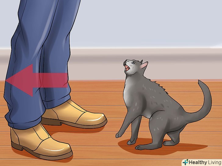 Відступіть. після виявлення у кота поведінкових ознак злості або страху вам найкраще відступити. Відійдіть на крок від тварини, щоб знизити його страх. Якщо можливо, покиньте кімнату, в якій знаходиться кіт; якщо ж кіт реагує на іншу людину або на іншу тварину, виведіть їх з кімнати. Якщо ви не можете покинути приміщення, переконайтеся в тому, що відступили, не перегородивши вихід коту, так як він зі свого боку теж може побажати піти. [10]- Вам, ймовірно, слід залишити кота на самоті на 10-20 хвилин, щоб дати йому можливість заспокоїтися.