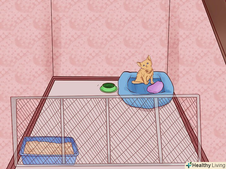 Помістіть кошеня в замкнуте приміщення. Коли візьмете кошеня в будинок, спробуйте потримати його в невеликому приміщенні кілька тижнів. Це допоможе кошеняті звикнути до нового місця і лотка і дозволить скоротити кількість калюж в недозволених місцях. [13]- Найкраще посадити кошеня в приміщення, де немає килимів, тому що так вам буде простіше прибирати за кошеням.