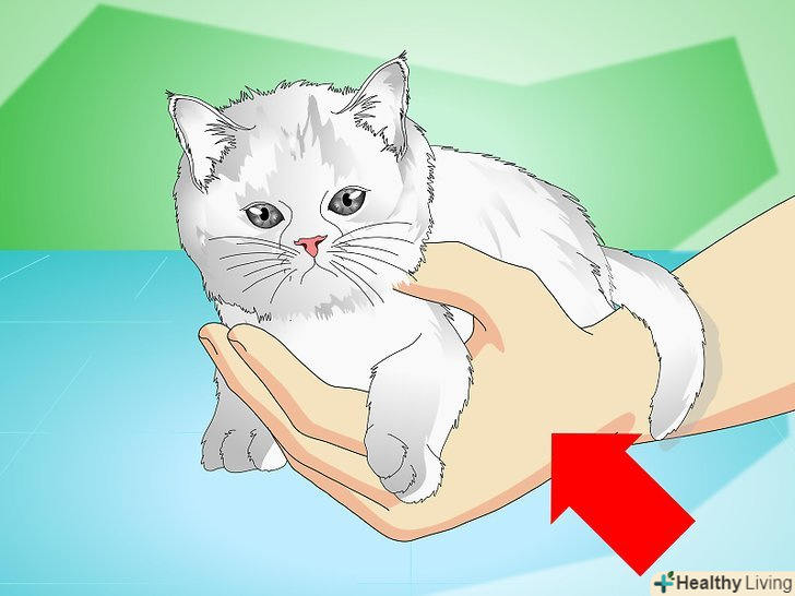 Візьміть кошеня на руки. багатьом кішкам стає спокійніше, коли вони сидять на руках у людини і коли їх гладять. Це нагадує їм відчуття від знаходження біля мами. Якщо регулярно тримати кошеня на руках, це дозволить соціалізувати тварину і допоможе йому розвиватися правильно. [10]- Беріть кошеня на руки акуратно [11] і двома руками, щоб він не впав.