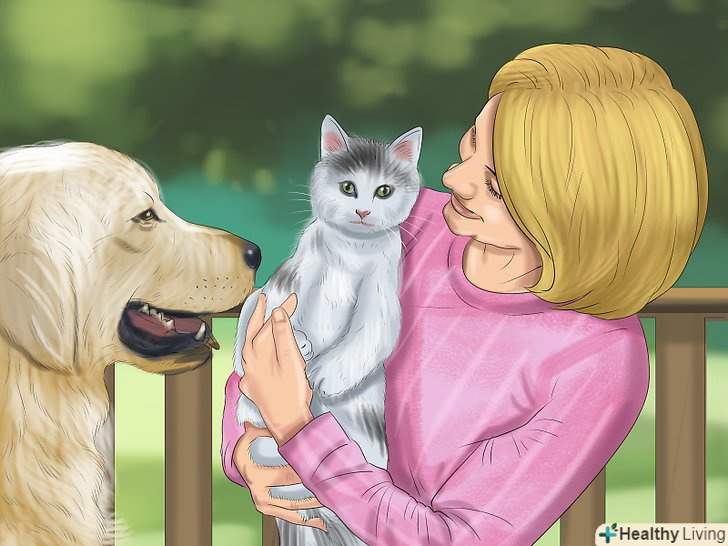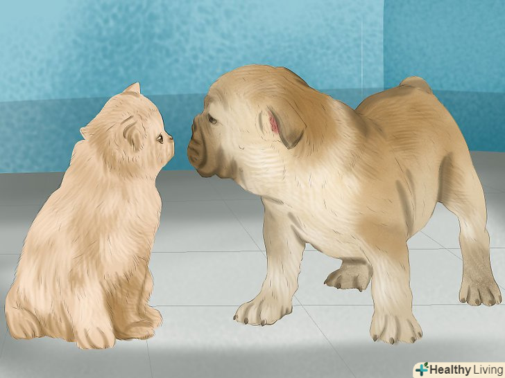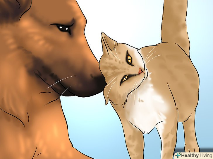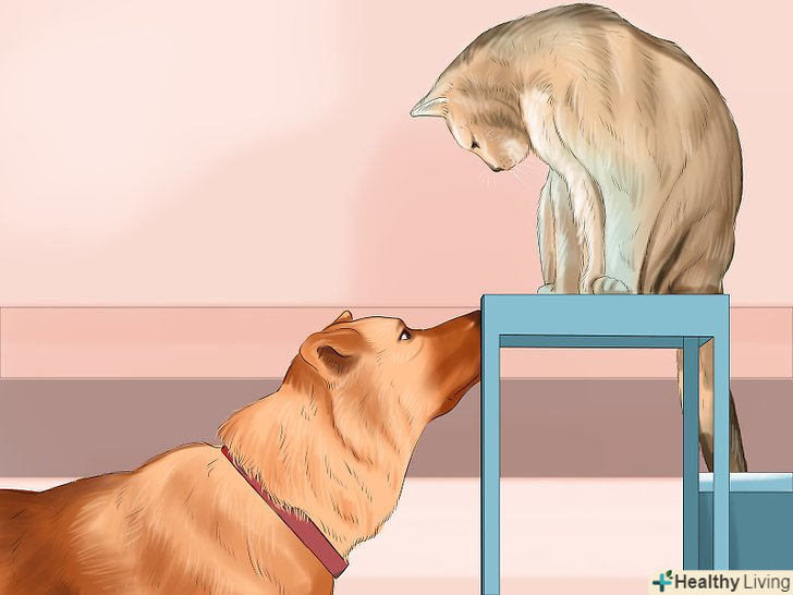 Надайте коту час на звикання до собаки. при кожній зустрічі кота з собакою дозволяйте йому самому вирішувати, що саме робити. Заводите собаку на повідку в одну із загальних кімнат свого будинку і потім подзивайте кота. Тримайте собаку на повідку і відволікайте її, поки кіт принюхується і вивчає собаку. Також не забувайте в процесі щедро пригощати і хвалити кота. [20] як тільки кіт почне спокійніше ставитися до собаки (і буде асоціювати її з появою частувань), ви помітите, що він стане все більше і більше проявляти до неї свій інтерес.- Весь процес зажадає від вас терпіння. Якщо собака починає занадто сильно звертати увагу на кота, а це викликає у кота явний стрес, відведіть її назад в окрему кімнату.
