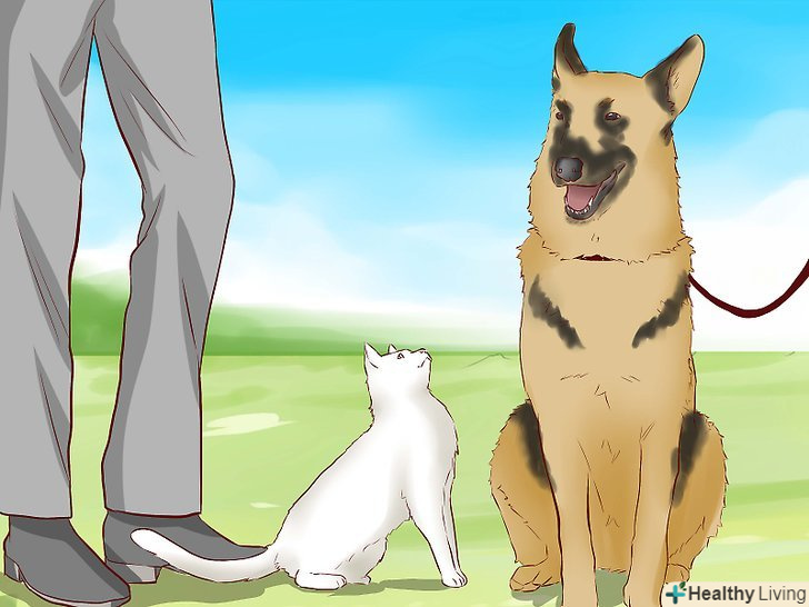 Посадіть собаку на поводок і уявіть вихованців один одному. у першу зустріч вихованців без розділяє хвіртки собака повинна бути на повідку, щоб ви могли краще контролювати ситуацію. Також вам слід надати собаці її улюблені іграшки, щоб відвернути її, поки кіт намагається вивчити нового вихованця, не привертаючи до себе уваги. [17]- Крім того, непогано влаштувати собаці пробіжку перед тим, як організовувати зустріч з котом. Це дозволить позбутися від надлишку енергії, тому собака буде помітно спокійніше дивитися на кота. [18]
