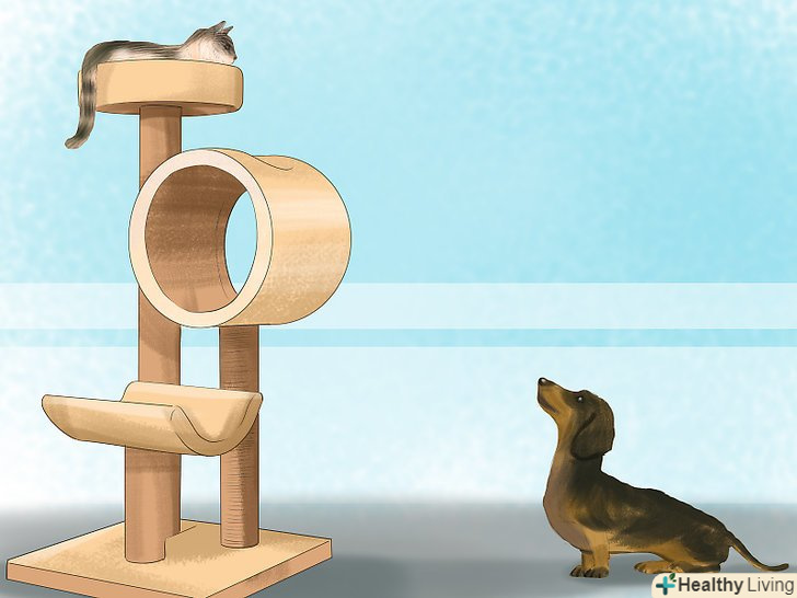 - Подумайте про придбання ігрового комплексу для кота. Високо розташовані платформи ігрового комплексу нададуть коту можливість сховатися від собаки в безпечному місці. Навіть якщо обидва тварини ладнають один з одним, кіт буде відчувати менший стрес, якщо буде знати, що у нього є таке місце, в якому він може усамітнитися.