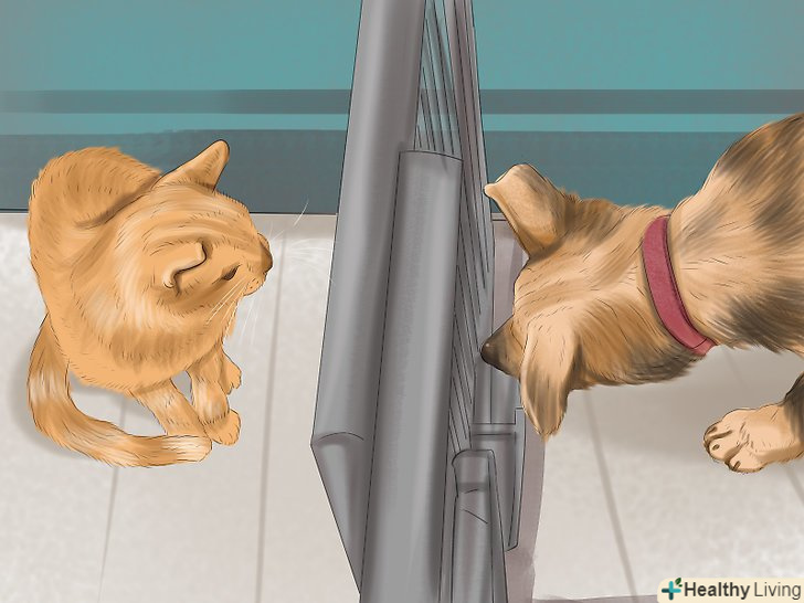 Відволікайте собаку, коли кіт наближається до неї. якщо ви помітите, що кіт проявляє інтерес до собаки і підбирається ближче до її імпровізованому загону, постарайтеся відвернути собаку. Дайте їй улюблену іграшку, почніть вивчати команди і так далі. Завдання полягає в тому, щоб відвернути її увагу від кота, щоб він міг поспостерігати за нею і вивчити її без зайвого занепокоєння через увагу собаки. [15]- Незважаючи на те, що це не завжди можливо з новим щеням або собакою, ви повинні спробувати навчити нового вихованця базовим командам , перш ніж помістити його в одну кімнату з кішкою, щоб у вас була можливість подати команду «сидіти» або «місце», якщо собака починає проявляти надмірний інтерес до кота.