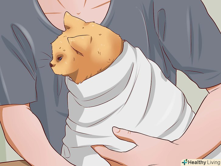 Витріть кішку рушником або висушіть феном. більшість кішок любить обтиратися рушником після купання. Використовуйте рушник, щоб витерти вихованця від голови до самого хвоста. Постарайтеся зібрати рушником якомога більше надлишкової вологи, так як кішка, ймовірно, буде обтрушуватися, а надлишки води будуть утворювати при цьому калюжі на підлозі ванної кімнати або кухні. [8]- Якщо ви віддаєте перевагу скористатися феном, щоб висушити вихованця, ніколи не налаштовуйте прилад на гарячий потік повітря, яким можна обпекти чутливу котячу шкіру. Налаштуйте фен на слабкий потік теплого повітря, який буде не таким гучним.