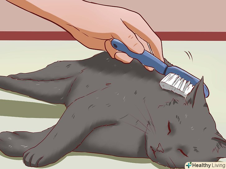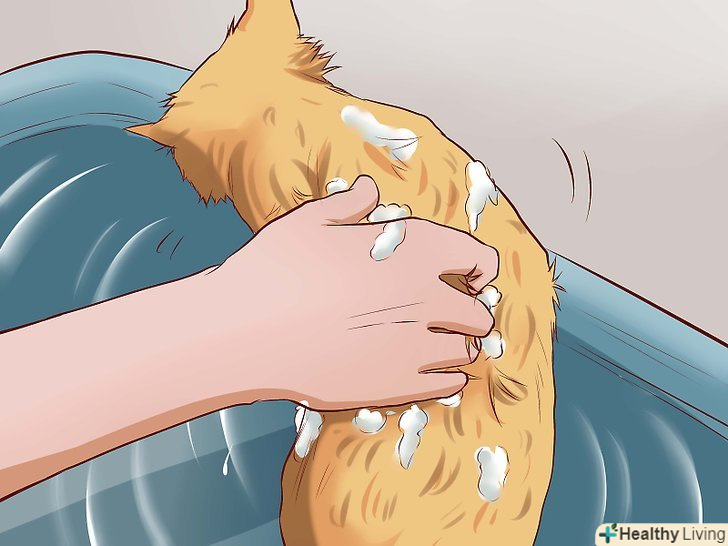 Намильте шерсть вихованця шампунем. Обов'язково намильте спину, шию, груди, живіт, хвіст і лапи кішки. Ретельно спіньте шампунь, щоб Він змив всі забруднення. [6]- Більшості кішок не подобається, коли водою поливають морду. Використовуйте вологу серветку, щоб обережно протерти цю зону і уникнути отримання подряпин або «скарг» з боку незадоволеного вихованця.