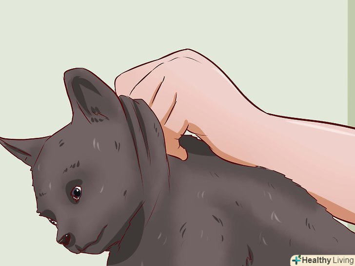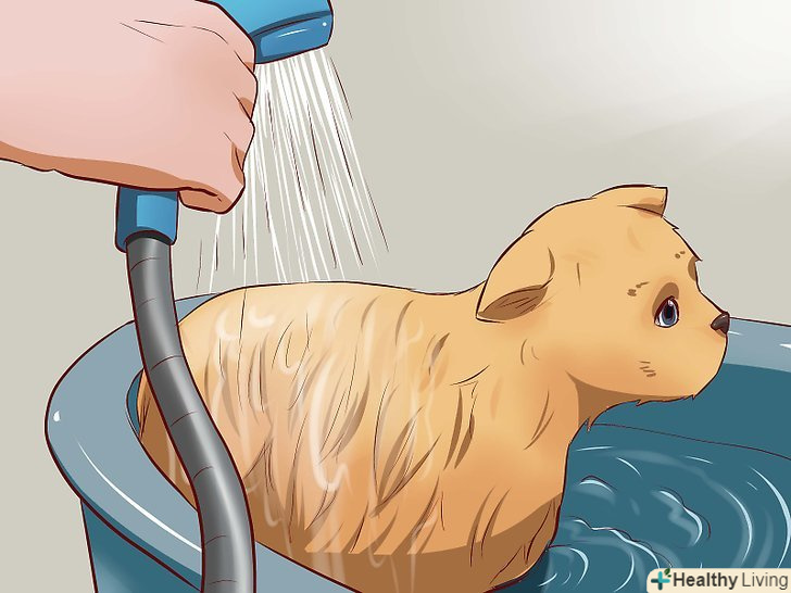 Поміщаючи тварина в раковину або ванну, притримуйте його за загривок. Ласкаво розмовляйте з кішкою підбадьорливим тоном, коли будете садити її в ванну або раковину. Притримуйте тварина за загривок, щоб воно залишалося на місці, або залучіть до цього помічника. Якщо у кішки не обрізані кігті на передніх лапах, її краще притримувати за спину, щоб воно не могла вас подряпати. [5]- Однією рукою погладжуйте тварина, поки іншою рукою поливаєте водою його голову і шию. Слідкуйте за тим, щоб вода не потрапила кішці в очі і не викликала роздратування. Далі якісно намочіть спину, лапи і попу тварини.