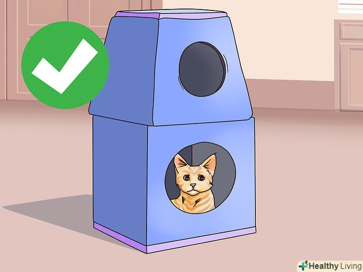 - Чи Можете ви розставити меблі і повісити полиці так, щоб кішка могла оглядати приміщення зверху? У дикій природі кішки забираються на дерева, якщо хочуть відпочити або якщо відчувають себе в небезпеці. Поставте високу когтеточку і будиночок біля книжкової шафи або вікна. Якщо вирішите поставити їх біля вікна, встановіть полку над вікном, щоб кішка могла застрибнути туди з верхнього майданчика будиночка. Якщо кішка буде відчувати себе в небезпеці або захоче поспати в захищеному місці, вона зможе забратися в найвище місце в кімнаті і відчути себе краще.