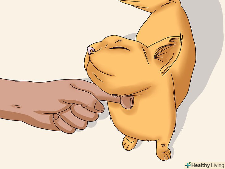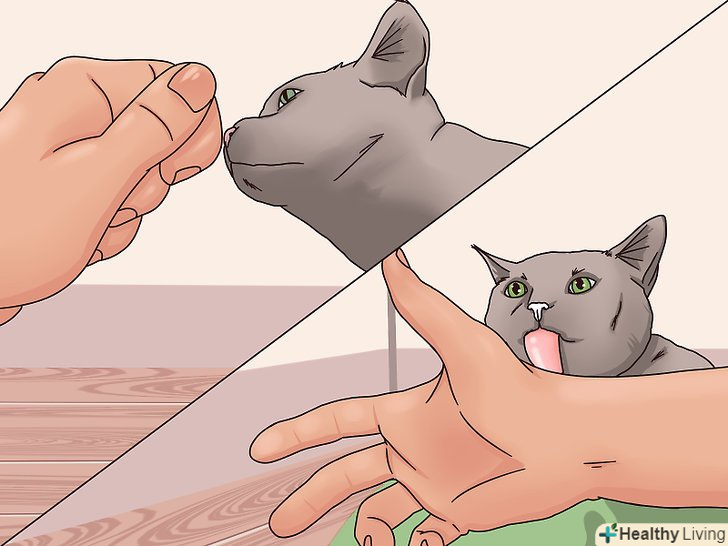Дозволяйте кішці нюхати і облизувати вас. у тварин на верхньому небі є особливі залози, які дозволяють їм як відчувати запахи, так і впізнавати людей та інших тварин. Чутливі ділянки в носі дають їм можливість вловлювати іншу інформацію. Це означає, що кішка може як обнюхати, так і облизати людину, щоб познайомитися з ним. [4] Облизування також може бути проявом алогрумінгу і прихильності. Кішки і деякі інші тварини часто вмивають один одного. Ця дія означає прийняття в котячу сім'ю. [5]- Не хапайте кішку. Кішка обнюхує людину, щоб зрозуміти, хто перед нею. Якщо ви знайомитеся з кимось, ви навряд чи станете обіймати людину силою після того, як вас представлять. Не варто хапати кішку, коли вона обнюхує вас.